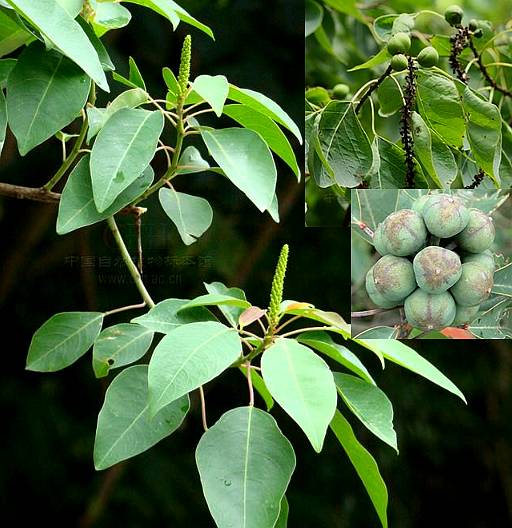 乔木或灌木,高3〜5米。枝条灰黑色,具小点状皮孔。 单叶互生;纸质;椭圆状卵形,长3〜10厘米,宽2〜5厘米, 先端短尖或钝,基部钝形,全缘,上面绿色,下面粉绿色;叶 柄长2〜7.5厘米,顶端有2腺体。花单性,雌雄同总状 花序顶生,密生黄色小花;雌雄花同在一花序上,但有时仅具雄花,无花瓣及花盘;雄花7朵聚生于苞腋内,苞片卵形, 先端锐尖,每侧各有腺体1,萼杯状,雄蕊2,很少有3枚者,雌花生于花序的近基 部,萼3,三角形,子房 卵形,3室,柱头3裂,向外反卷。蒴果室背开 裂;种子近球形,外被蜡 层。花期4〜6月。果 期7〜8月。