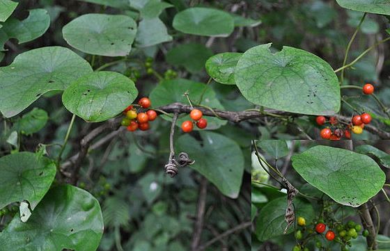 木质菔本,长4〜5米,全体无毛。块茎粗壮。小枝有细纵 条纹。叶草质或近纸质,互生,宽卵形或卵形,长4〜8厘米, 宽3〜7.5厘米,先端 钝,基部圆形、近截形 或微心形,全缘,下面通 常粉白色,掌状脉7〜9 条;叶柄盾状着生,长 5〜8厘米。花单性,雌 雄异株,•花序伞状至聚 伞状,腋生;总花梗长 2.5〜4厘米,分枝4〜8;花小,淡绿色,有梗;雄 花萼片6〜8,卵形或倒 卵形;花瓣3〜5;雄蕊 花丝愈合成柱状体;雌 花萼片3〜5;花瓣与萼 片同数;无退化雄蕊;花 柱3〜6裂,外弯。核果 近球形,径约6毫米,红色。