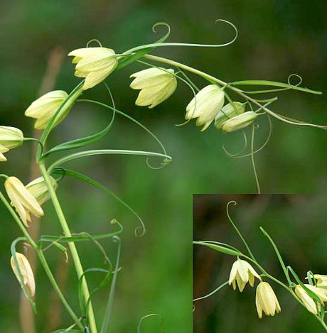 多年生草本,高15~55厘米。鳞茎圆锥形或近球形,直径5~12毫米。茎直立,绿色或微带褐紫色,具细小灰色斑点。叶片着生在茎上部1/3或1/5的部分,通常下端对生,上端3叶轮生,少为互生;叶片线形,长5~12厘米,宽2~10毫米,先端卷曲呈卷须状。花单生于茎顶,少有2朵,下垂,钟状;花被6片,菱状椭圆形,长2.5~3厘米,外轮3片较挟,先端钝圆或梢尖,黄绿色,具紫色方块纹及脉纹:雄蕊6,长1~1.5厘米;子房3室,花柱较粗,柱头3歧而外反。蒴果六角矩形,长7~20毫米,径达12毫米。种子薄而扁平,半圆形,黄色。花期6月。果熟期8月。