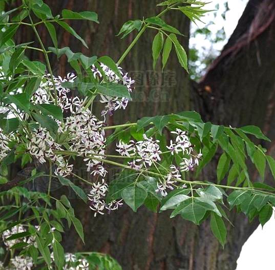 乔木,高达10余米。树皮灰褐色,小枝灰黄色。2回单数 羽状复叶,互生,总叶柄长5〜12厘米,羽片4〜5对,各对 间距离疏远;小叶2〜5对,卵形或窄卵形,长4〜7厘米,宽 2〜3.5厘米,先端渐尖或长渐尖,基部圆形,常不对称,全 缘或有疏锯齿。圆锥状聚伞花序,腋生,密生短毛及星状 毛;总花梗长达10厘米;花淡紫色,直径6〜8毫米;萼5〜 6片,灰绿色;花瓣5〜6枚,狭长倒披针形;雄蕊2倍于花 瓣数,花丝连合成管状;子房瓶状,6〜8室,偶或5室。核果长圆形或近圆形,黄色或栗棕色。种子扁平长椭圆形,黑色,长约1厘米。花期 3〜4月。果期9〜11月。