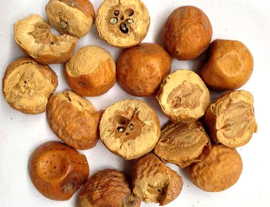 【药材】干燥果实呈球形或椭圆形,长径1.5~3厘米,短径1.5~2.3厘米。表面黄色或黄棕色,微具光译,具深棕色或黄棕色圆点,微有凹陷或皱缩。一端凹陷,有果柄脱落痕迹,另一端较平,有一棕色点状蒂痕。果皮革质,与果肉间常有空隙。果肉厚,浅黄色,质松软。果核球形或卵圆形,两端平截,土黄色,表面具6~8条纵棱,内分6~8室,含黑紫色扁梭形种子6~8枚。种仁乳白色,有油性。气特异,味酸而苦。以表面金黄色,肉黄白色,厚而松软者为佳。