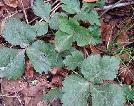 多年生草本,高30~50厘米,全株无毛。根敷条,细长,稍弯曲,黑褐色。茎直立,圆柱形,有纵棱,稍有分枝。基生叶心脏三角形,掌状3深裂,裂片卵形或椭圆形,长2.5~5厘米,宽1.5~3厘米,有时3浅裂,先端锐尖,基部心形,边缘有尖锯齿,中间裂片菱状椭圆形,侧裂片平展,斜卵形;叶柄长6~16厘米。复伞形花序顶生;总苞片数个,条形;小总苞片约10个,条形;花梗多数;花小,白色。双悬果倒卵形,长2毫米,具先端弯曲的皮刺。