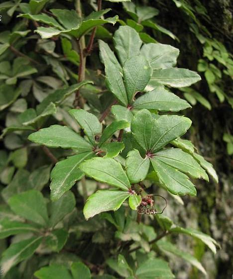 多年生攀援藤本,长3〜5米。根肥大,纺锤形,皮紫红色,质坚韧。缠绕茎细长,表面有细沟纹;卷须不分枝卷 曲。质坚韧。叶互生,掌状复叶;小叶5枚,具短柄,椭圆状披针形,中央一枚最大,基部两枚较小,先端渐尖,基部楔形,叶缘具浅波状锯齿,上面绿色,下面灰白色, 花杂性异株,伞房花序 排列成聚伞花序;花细小,黄绿色。浆果球形,肉质。