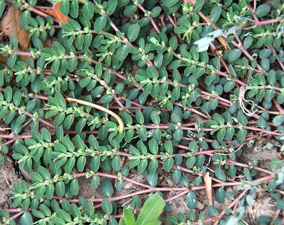一年生草本,含白色乳汁。茎匍匐,多分枝,稍被毛,高不及15厘米,通常红色。叶对生,椭圆形至矩圆形,长4~6毫米,很少达8毫米,宽2~4毫米,先端钝,基部偏斜而截头状,边缘有极小的锯齿,上面深绿色,下面浅绿带灰白色;叶柄甚短;托叶细小,生于叶柄基侧。杯状花序单生或少数聚伞状排列于叶腋;几无柄;总苞陀螺状,淡紫色,长约1毫米;腺体4,漏斗状;花单性,无花被;雌雄花同生于总苞内;雄花多数,只具雄蕊1;雌花1,生于花序中央,子房3室,花柱2,离生且顶端2裂。蒴果有毛,卵状三棱形,长1.5毫米许。种子有纵沟纹5~6条。花期夏季。