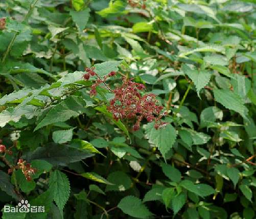 落叶蔓生灌木。茎有灰色绒毛和红紫色腺毛,散生弯曲的钩刺。单叶互生,长椭圆状卵形或披针形,长5~10厘米,宽2~3.5厘米,先端渐尖或钝圆,基部心形,边缘有细锯齿及波状浅裂,上面有粗毛,下面有灰色及褐色绒毛;叶柄长0.5~2厘米,有刺与细毛:托叶丝条状。圆锥花序密生绒毛及腺毛;萼片5,披针形,直立,有红棕色腺毛;花瓣5,白色,径约8毫米;雄蕊多数,分离;雌蕊多数。聚合果球形,黑色。