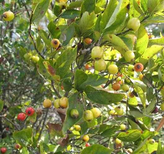 落叶灌木,高1~3米。小枝红褐色,无毛。叶草质,椭圆形、椭圆状卵形或菱状卵形,长4~8厘米,宽1.8~3.8厘米,先端渐尖或尾尖,基部宽楔形或近圆形,边缘有带腺锐锯齿,上面初有毛,后脱落,下面无毛,侧脉4~6对;叶柄长1~2毫米。伞形花序生于侧枝顶端,有花2~9朵,无总花梗;花梗长1~3.5厘米,有疣点;花白色,径1~1.5厘米;萼筒杯状,裂片5,卵形;花瓣5,圆形。梨果椭圆形或卵形,直径5~7毫米,橘红色或紫色。