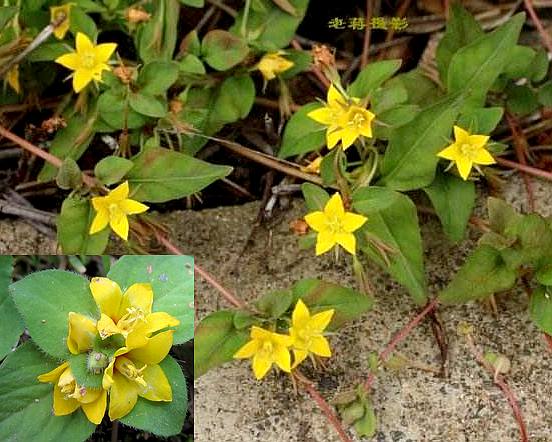 多年生草本。茎浓紫红色,具短柔毛,分枝多,下部匍匐,节处生不定根,上部斜升,长枝达20厘米。单叶交互对生,枝端密集,略被短柔毛;叶片广心形,长达25毫米,宽达19毫米,先端钝尖,全缘基部楔形,上面淡绿色,下面色更淡,边缘有绿红色小点;柄长约5毫米。花黄色,单生于枝端叶腋,成密集状;苞片卵形或亚圆形;淡绿色,下部边缘紫红色;花梗极短;花径约8毫米;花萼5深裂,裂片披针形,长6毫米,宽1.5~2毫米,被极短柔毛;花冠轮状,下部合生,裂片5,卵形,先端锐尖,成覆瓦状排列;雄蕊5,长短不一,长约6.5~8毫米;子房上位,卵形,被长白柔毛,1室。果为蒴果,种子多数,萼宿存。花期3~4月。