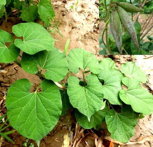 多年生缠绕草本,全体有微柔毛。茎圆柱形,上部多分枝。叶对生,有长柄;叶片广卵形,宽5~11厘米,先端尖,全缘,基部深心形,两侧呈圆耳状下延或内弯。聚伞状花序臃生,花黄白色;萼与花冠各5深裂,裂片向下反卷;副冠5,钻状披针形,高出柱头;雄蕊5,着生于花冠基部,花丝连成筒状,药附着于柱头周围;雌蕊由2心皮组成。甚?果长约11厘米,宽约1.2厘米,成热时沿一侧开裂。种子卵形而扁,褐色,先端有一束白亮的长绒毛。花期8~10月。果熟期11月。
