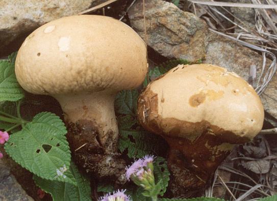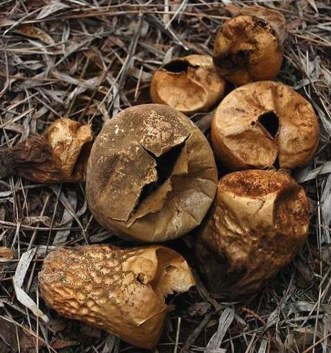 ③紫颓马勃:子实体陀螺形,直径5~12厘米,不孕基部发达;包被薄,两层,上部常裂成小块,逐渐脱落,内部紫色,当孢子及孢丝散失后遗留的不孕基部呈杯状;孢子粉状,球形,直径4~5.5微米,上有小刺;孢丝很长,分枝,有横隔,互相交织,色淡,粗2~5微米,