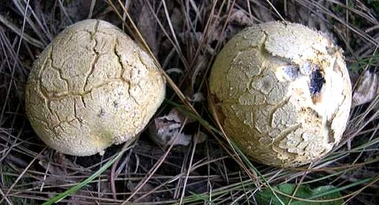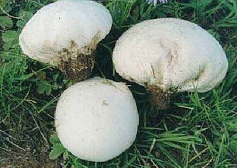 ②大颓马勃:孑实体球形或近球形,直径15~20厘米,或更大,不孕基部无或很小;包被白色,后变浅黄或淡青黄色,由膜状外被和较厚的内被所组成,初微具绒毛,渐变光滑,质脆,成熟后开裂成块而脱落,露出浅青褐色的孢体;孢子粉状,球形,光滑或有时具细微小疣,淡青黄色,直径3.5~5微米;孢丝长,与孢子同色,稍分枝,有稀少横隔,粗2.5~6微米。