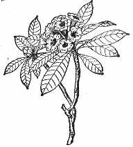 常绿乔木,高 3〜8米。树皮掠 色,呈不规则片 状剥裂。叶互生;长椭圆状披针 形,长10〜15厘 米,宽3〜4厘米,先端短尖,基部 楔形,边全缘而 微波状,上面深 绿色,下面淡掠 色,密被黄棕色 绒毛。花多数簇 生于枝顶,成伞丽,紫红色,花冠漏斗状,直径3〜5厘米。蒴果圆柱形,有五棱,被黄棕色绒毛。花期春季。