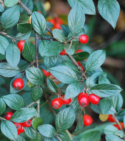 灌木,高1.5〜2.5 米。树皮红褐色;枝密生,韧性磕易折断,小枝最初有软毛,最后几无毛。单叶互生或 5〜10片聚生于短枝上,卵圆形至披针形,长1〜2厘米,先端急尖或渐尖,基部楔形,全缘,上面绿色,下面被白色绒 毛;叶柄长2〜5毫米,具毛。花白色或粉红色,6〜10朵排列成密生的伞房花序,生于小枝顶端#花萼筒有白色毛茸,萼齿三角卵圆形;花瓣平展,卵圆形•梨果倒卵形,较小,紫红色,有核2〜3枚。