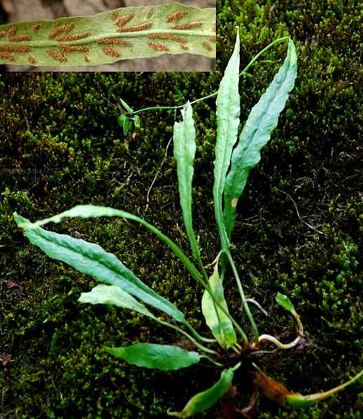 小形植物,高10~20厘米。根状茎短,直立,顶部密生狭披针形黑褐色鳞片。叶簇生,二型,草质,两面无毛;营养叶较短,叶片披针形或矩圆形,长1~2厘米,宽5~8毫米,钝头或渐尖,基部宽楔形;能育叶有长柄,叶片披针形,长10~15厘米,宽5~8毫米,先端渐尖.并延伸而着地生根,产生新株。孢子囊群生于网脉的一侧或两侧;囊群盖短条形或矩圆形,膜质,全缘。