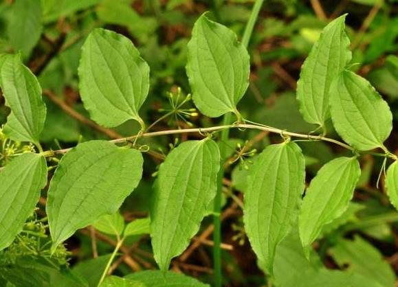 多年生草本,攀援状茎细 长,有纵条,无皮刺。叶互生;卵形、长圆状卵形至卵状波针形,长6〜9厘米,宽2.8〜6.5厘米,先端渐尖或突尖,基部楔形或近圆,两面光滑无毛;叶柄基部具卷须2根。花单性,异株;花序伞形,腋生;花被6片,离生,向外反折;雄花有雄蕊6,较花被裂 片为短;雌花较雄花小,退化雄蕊线形,子房球形,柱头3 裂。浆果球形,黑色。花期6月。生于山坡、林缘或林内。我 国秦岭以南地区均有分布。