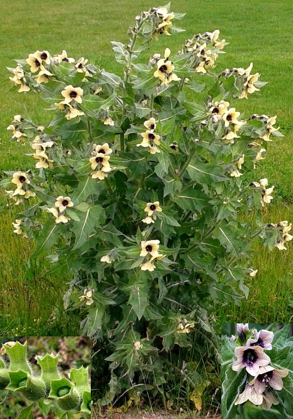 一年生或二年生草本,有特殊臭味。根肉质、粗大,多分枝。茎高40~80厘米,上部具分枝,全体被白色腺毛。基生叶大,叶柄扁宽而短,叶片长卵形,长14~20厘米,呈不整齐的羽状浅裂,裂片三角形或窄三角形,先端急尖,两面被白色直立长柔毛及腺毛,以下面较多;茎生叶互生,排列较密,无柄,卵状披针形,每侧有2~5个疏大齿牙或浅裂,叶渐上渐小,最上部的叶常呈交叉互生,成2列状。花腋生,单一,径2~3厘米;萼杯状,绿色,5齿状浅裂,外被直立白柔毛;花冠漏斗状,5浅裂,常有一裂隙较深,裂片先端圆钝,浅黄色,具紫色网状脉纹,外被短柔毛;雄蕊5,着生于花冠管上,不等长,略与花冠管等长,花药深蓝紫色;子房略呈椭圆形,花柱单一,柱头头状。萼管基部膨大,宿存,内包壶形蒴果,2室,盖裂。种子多数,呈不规则阔肾形,胚弯生。花期5月。果期6月。