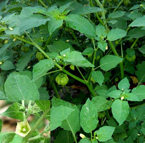 一年生草本,高50厘米左右。茎微卧或倾斜,多分枝,具细柔毛或近光滑。单叶互生;叶片卵圆形或长圆形,长2~8厘米,宽1~5厘米,先端短尖,叶基不等,全缘或波状,或具有不规则的缺刻,上面绿色,近于无毛,下面毛较多;叶柄长1~4厘米,有毛。花单生于叶腋;花柄长约5毫米;萼钟形,绿色,膜质,5裂,有硬毛,结果时萼增大如灯笼状,直径约1.5厘米,包围在果实的外面,具有突出的5棱;花冠钟形,5裂,淡黄绿色,长约8毫米,近冠管基部有斑块;雄蕊5,着生于花冠管的基部,花药长圆形;雌蕊1,子房圆形,2室,胚珠多数,花柱线形,柱头头状,呈不明显的2裂。浆果圆珠形,黄色,直径约1厘米;种子多数,扁圆形,绿白色。花期6月。果期7月。