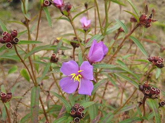 多年生直立草本或亚灌木,高30~80厘米。茎四棱,具粗毛。叶对生;线形,线状矩圆形或披针形,长3~7厘米,宽5~8毫米,先端短尖,全缘,基部圆形,主脉3~5条,两面有粗毛;叶柄短。花数朵,顶生,成头状花序,无柄;叶状总苞片2~5枚;苞片卵形,边缘有睫毛;萼筒长5~6毫米,秃净,裂片4,三角状披针形,具睫毛,片间基部具睫毛的鳞片4枚;花瓣4,淡紫色,稀有白色,卵形,长约1厘米;雄蕊8,偏于一侧,花药顶端单孔裂,有一长喙;子房下位,4室,顶有刚毛16条。蒴果顶端4孔开裂,宿萼杯状,长约6毫米,近顶部略收缩,截头形。花期7~8月。果期10~11月。