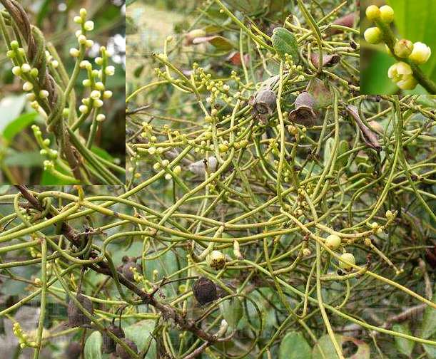 缠绕草本,借盘状吸根攀附于其他植物上,幼嫩部分被柔毛。茎线状,极长,绿色或绿褐色,无毛或稍被毛,叶退化成细小的鳞片状。穗状花序长2~5厘米,有微小的小苞片;花白色,小,无梗,长不及2毫米,花被片外面的3枚较小,圆形,声绿色毛,内面的3枚较大,卵形;雄蕊9枚,3轮,第1轮的花丝花瓣状,其余为线状:雌蕊1,子房上位。浆果小,球形,肉质,径约7毫米,花被宿存。花期8~12月。果期11月至翌年2月。