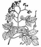 木质蘑本,全体无毛;卷须粗壮。1回羽状复叶,有小叶3~5个,或为近2回羽状复叶(即最下一对小叶再各分为3小叶);小叶近革质,卵形或矩圆形,大小不一,长2~8厘米,先端短尖,基部圆钝,有时阔楔形,边缘有不明显的钝齿。3~4回2歧聚伞花序;花长约2毫米;花柄与花等长;萼边缘不分裂;花瓣5,顶端钝;花柱锥尖。果倒卵状扁球形,直径5~6毫米,熟时紫黑色。