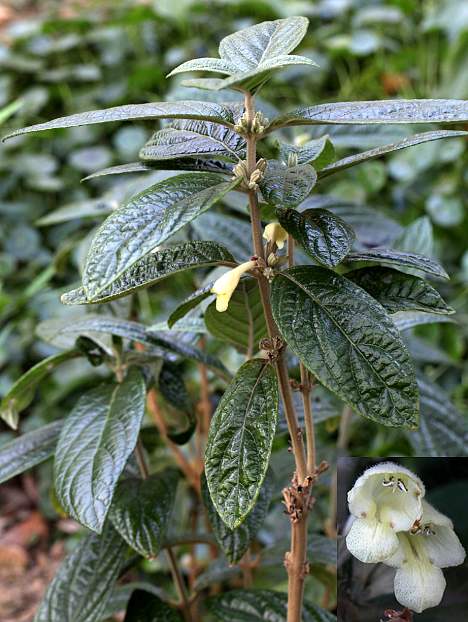 亚灌木,高1〜2米。幼枝四方形,密被灰黄 色星状毛。单叶对生;叶 片长椭圆形,长10〜20 厘米,宽5〜10厘米,叶缘具细锯齿;叶柄及叶背密被灰黄色星状毛。稀穗状花序成对生于叶 腋,花梗长于叶柄,有叶状小苞片,被星状毛;花红色;萼10脉,5等裂;花冠管纤弱,喉部扩大,肢2唇形,上唇头盔状,下唇阔3裂;雄蕊4;子 房4裂。小坚果。生于竹林边或灌木丛中。分布云南。
