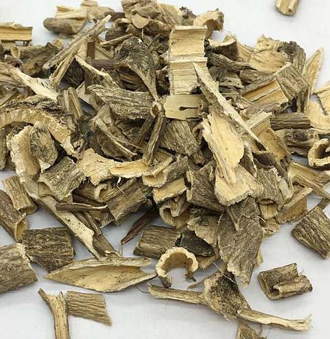 【药材】干燥的茎皮或根皮呈半圆筒或圆筒状,长15~25厘米,宽窄及厚薄多不一致,通常宽0.7~1厘米,厚约2毫米。外皮粗糙,土灰色,有纵向的皱纹及横向的小突起(皮孔);内表面淡黄绿色,现明显之丝状纤维。不易折断,体质轻泡。气弱,味淡。以条长、宽、厚、少碎块者为佳。