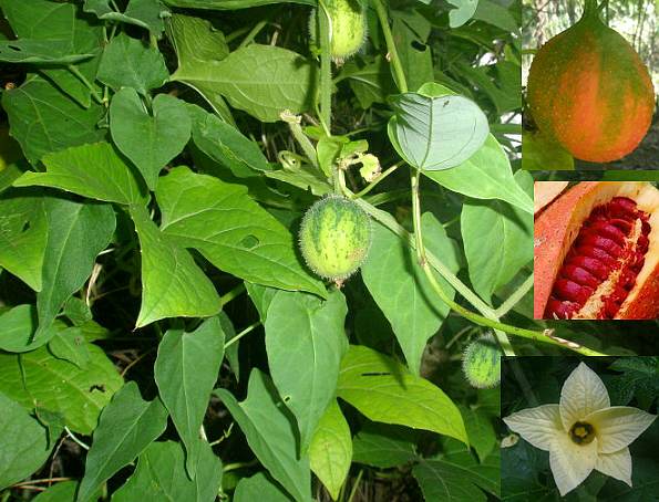 多年生草质藤本,具膨大的块状根。茎有纵棱;卷须粗壮,与叶对生,单一,不分枝。叶互生,圆形至阔卵形,长7~14厘米,通常3浅裂或深裂,裂片略呈卵形或长卵形,全缘或具微齿,基部近心形,先端急尖,上面光滑,下面密生小乳突,3出掌状网脉;叶柄长5~10厘米,具纵棱,在中部或近叶片处具2~5腺体。花单性,雌雄同株,单生叶腋,花梗细长,每花具1片大型苞片,黄绿色;雄花:萼片5,革质,粗糙,卵状披针形,基部连合,花瓣5,浅黄色,基部连合,雄蕊5,愈合成3体;雌花:萼片线状披针形,花冠与雄花相似,子房下位。瓠果椭圆形,成熟后红色,肉质,外被软质刺灾,种子略呈扁圆形或近椭圆形,边缘四周具不规则的突起,呈龟板状,灰棕色。花期6~8月。果期9~11月。
