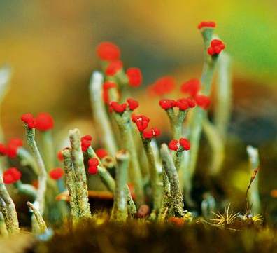 地衣体鳞片状,生于f器柄基部和上部,表面灰绿色,里 面灰白色,稀瓣裂。子?柄祖壮,直立成树枝状,形如鹿角/ 高5厘米左右,直径约1.5毫米,呈灰白色或青绿色,无粉芽及针芽。顶端生杯状 体,其周边延生呈掌状, 上生多数子器;子器小, 半球形或多数合生成不 规则的庞状突起。子囊 盘淡黄褐色或深褐色。