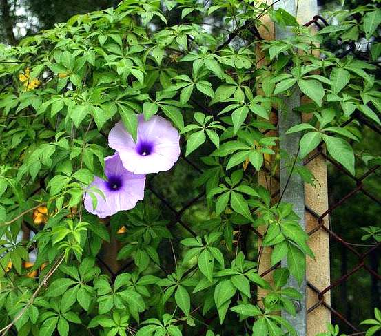多年生柔弱、?净、缠绕藤本。茎灰绿色,常有小瘤体, 叶互生;通常指状5深裂,几达基部,直径(3〜9厘米,裂片 椭圆状披针形,先端钝,但有小锐尖,全缘或最 卞一对裂片有时再分 裂,两面均?净,叶柄略 长于叶,常有小瘤体。聚 伞花序,花序柄短,有花 1〜3朵;萼绿色,长6〜8毫米,先端极钝;花冠 漏斗状,淡紫色,长5〜6 厘米,内面颜色较深;雄 蕊5枚。蒴果,种子4 颗,灰棕色,短而圆,背 部两侧棱角有长绵毛。 花期夏、秋。
