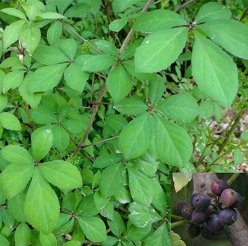 ②无梗五加:灌木,高至4米。枝上有锥形的硬刺或无刺。掌状复叶,小叶3~5枚,矩圆状倒卵形或倒卵形至矩圆状倒披针形,长3~8厘米,有不规则锯齿,几无毛;叶柄长3~6厘米。花暗紫色,几无柄,成密生球形头状花序生于有细毛的短梗上,通常数个生于小枝顶端。果黑色,阔椭圆形,长10~14毫米。花期8月。果期9月。