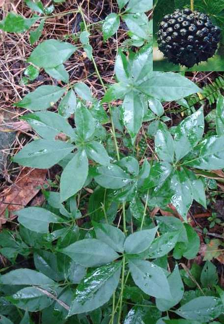 ⑤轮伞五加:灌木,高2~3米。枝棕褐色,枝和叶柄基部有小倒刺。叶互生或簇生于短枝上;掌状复叶,小叶3~5片,倒卵形或卵状披针形,边缘有锯齿,齿端有小刺毛,基部楔形或斜形,叶脉上有刺毛,主脉于下面稍突起。伞形花序腋生或顶生,多成轮状排列;花小,多数;花瓣5,黄绿色。果近球形,熟时紫黑色;内有种子2粒。