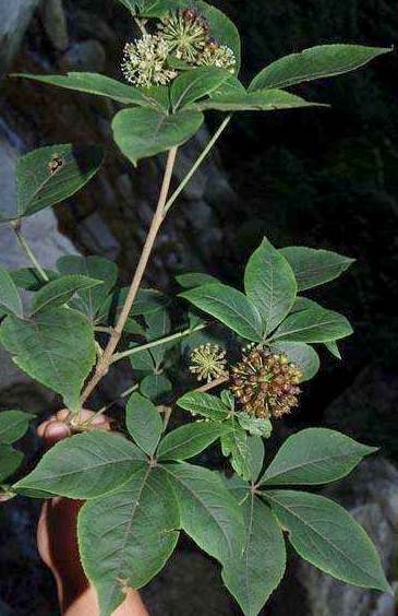 落叶灌木,高2~3米。茎直立或攀援,分枝无刺或有外曲刺,刺通常单生于叶柄的基部。叶互生或数叶簇生于短枝上;叶柄长4~9厘米,光滑或疏生有小刺;掌状复叶,小叶5枚,少有3或4枚,顶端1枚较大,两侧小叶渐次较小,倒卵形至卵状披针形或近菱形,长3~8厘米,宽1.5~4厘米,先端尖或渐尖,基部楔形,边缘具锯齿,两面光滑或仅沿脉上有锈色绒毛;小叶无柄。伞形花序,单生于叶腋或短枝末梢,花序柄长1~3厘米,果时伸长;花多数,黄绿色,直径约2厘米,花柄柔细,光滑,长6~10毫米;萼5齿裂,裂片三角形,直立或平展;花瓣5片,着生于肉质花盘的周围,卵状三角形,顶端尖,开放后反卷;雄蕊5;子房下位,2室,花柱2枚,分离,柱头圆头状。浆果状核果近球形,侧向压扁,直径约5毫米,熟时紫黑色,近中央有纵脉3条。种子2粒,细小,半圆形而扁,淡褐色。花期5~7月。果期7~10月。