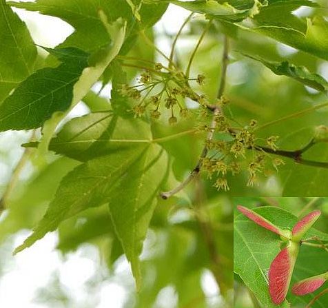 落叶乔木,高3~10米。树皮灰色,小枝平滑无毛。叶5裂,长10~14厘米,宽12~15厘米,基部心脏形,有时截形,裂片卵形,先端渐尖,边缘有稀疏紧贴的锯齿,近革质,上面绿色,光泽,下面粉白色,于脉腋内有细毛;叶柄长3~4厘米,通常带红色。圆锥花序,长5~10厘米;花杂性,萼片5,绿色;花瓣5,白色;雄蕊5~8;花盘肥厚,微有疏柔毛;子房有白色疏柔毛。翅果淡黄色,长约3厘米,两翅展开成钝角。花期5月。果期9月。
