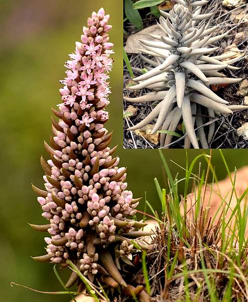 多年生肉质草本,高10〜20厘 米。茎光滑无毛,全株被白粉及棕 红色腺点,基部尤多。叶卵状披针 形,或长圆状卵形,先端锐尖,微弯, 有小尖头突出,全缘或具微细的波 状齿。花序间叶状苞片卵状披针形 或镰刀形;花密集成窄长圆锥状总状花序;花淡红色或白色;萼片5, 披针形,长约为花瓣的一半;花瓣 6,线状披针形或卵状披针形,基部 相连;雄蕊10, 5枚较长,伸出花冠 外,另5枚较短,生于花冠内;心皮 5,花柱与短雄蕊等长。花期8〜9 月。果期9〜11月。