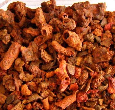 ②管黄:呈管状或破碎的小片,表面不平或有横曲纹。长约3厘米,直径约0.5~1.5厘米,表面红棕色或棕褐色,不光滑,有裂纹及小突起。断面也有很少的层次,内心多有空隙,色较深。