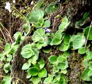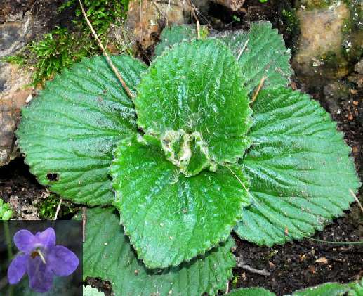 多年生草本。叶基生,广椭圆形至近圆形,长 3〜5厘米,宽2.5〜4厘 米,先端纯,基部阔模 形,边缘具不规则钝圆 齿,上面绿色,被绿色长 茸毛,下面色浅,被棕色 毛茸,叶脉凸出。花茎 长约10厘米,被棕色毛 茸;小花数朵,聚伞状 排列;花柄长约8毫米,密被毛茸;萼片5,基部 联合,裂片披针形,被 毛,长约2毫米;花冠2 唇形,裂片5,、淡红色,长7〜10毫米;发育雄 蕊2;子房无柄,线形, 2心皮组成,柱头小。蒴果胞背开裂,裂片扭捩。花期春夏间。