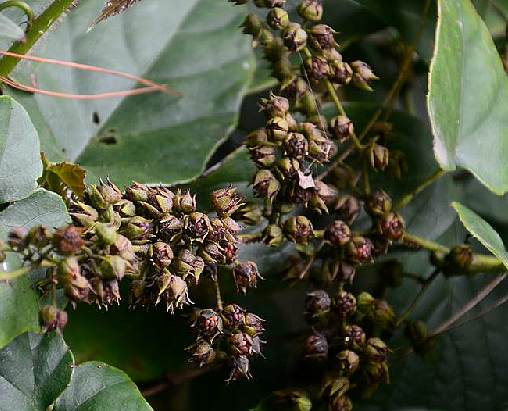 常绿攀援或匍匍灌木,高1〜1.5米。茎细长,具有柄腺 毛,或脱落,散生小钩状皮刺。叶互生;近革质;卵状披针形 或长圆状卵形,长8〜15厘米,宽4〜7厘米,先端渐尖,基 部深心形,边缘疏生具凸 头的小据齿,近基部常有 小裂片,两面无毛,下面中 脉和叶柄有皮刺;叶柄长 2〜3厘米。圆锥花序顶 生,长15〜25厘米,或其 下各叶腋生总状花序;花 白色,直径6〜8毫米;花 梗短,疏生柔毛和腺毛;萼 5裂,裂片披针形,先端钻 状,果时反折;内外两面有 柔毛;花瓣较萼裂片短;雄 蕊多数,花丝扁;心皮多 数,分离。聚合果球形,直 径5〜7毫米,红色,只有 10多个小核果。花期4〜5 月。果期6〜8月。 于山坡灌丛中,路边及林缘分布四川、贵州、广西、湖 北等地。