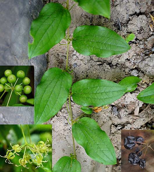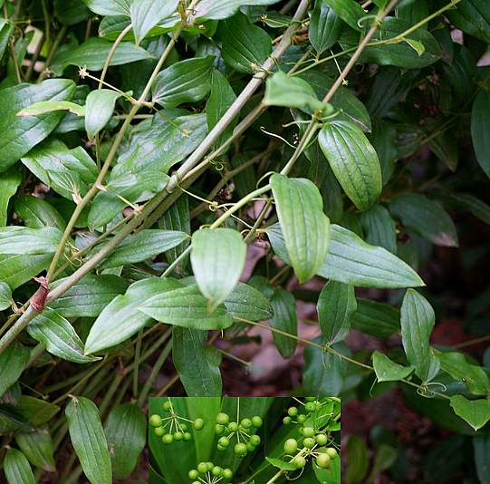 攀援状草质藤本,具纵沟,无毛。根茎具多数细长须根* 叶互生,卵状披针形至披针状长椭圆形,长2.5〜8.5厘米, 宽2〜4.6厘米,先端尖或渐尖,?部截形至圆形,基出脉 3〜5,脉间网状,上面光泽,下面淡粉色;叶柄基部具线状卷 须1对。花单性,雌雄异株;伞形花序腋生,具长总梗,苞片 披针形;花淡黄绿色,雄花花被6,裂片披针形,雌花较雄花 为小;子房球形,花柱3裂。架果成熟时紫黑色。生于山坡林下*分布广东、广西、陕西、浙江、江苏、江西、 贵州等地。