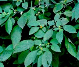 一年或二年生草本。茎直立、分枝,高60〜100厘米,基部木质化,全体密被柔毛,以幼枝 为最多。单叶互生;有 柄;叶片卵形,长5〜10 厘米,宽3〜6厘米,先 端渐尖,基部突尖而下 延至柄上,全缘,两面均 疏被柔毛。花单1‘或2〜6个聚生于叶腋,长4〜8毫米,多少下弯,被 毛;萼短,阔钟状,有线 状裂齿10枚,被毛;花 冠白色,直径约8毫米, 5裂至中部;雄蕊5,花药顶裂;子房2室。浆果球形,直径 C〜8毫米,红色,光滑无毛。花期夏、秋。生于荒野。分布广东、贵州等地。