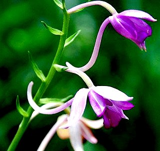 多年生草本。具数条肉质块根,白色或黄白色。茎直立,粗壮,高可达80厘米。叶 互生,卵圆形至长椭圆形, 先端尖,基部鞘状抱茎,两 面光滑,叶脉平行,全缘; 吝上部叶渐狭小,苞片状。 顶生总状花序,花10余朵, 白色;背萼片舟k,侧萼片 宽卵形,偏斜;花瓣线形, 稍短于背萼片,唇瓣线形, 长1.5厘米,距下垂,甚 长,达3〜6厘米9蒴果淡 绿色。花期夏季。
