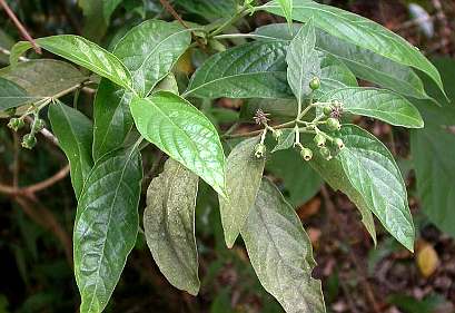 灌木,直立。枝有棱,具毛。叶对生,椭圆形,长5〜12厘 米,宽2.5〜4.5厘米,先端近短渐尖,基部楔 形,全缘,上面深绿色,下 面浅绿色,两面均有毛,中脉及侧脉更为明显;叶柄长0.3厘米。聚伞花 序顶生或腋生;总花梗 长0.6〜1厘米,有毛。浆果圆球形,长约0.4 厘米,有毛。花期4月。