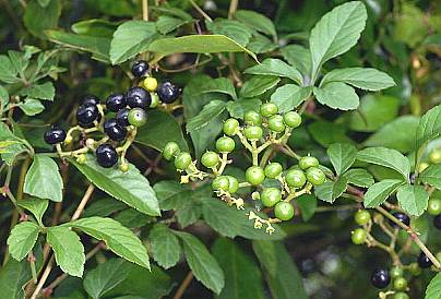 多年生蔓生草本。茎紫绿色,有纵棱,具卷须,幼枝有柔毛,后变光滑。叶为掌状复叶,具小叶5枚,排列成鸟爪状,中间小叶椭圆状卵形长4~6厘米,宽2.5~3厘米,小叶柄长2~3厘米,先端短尖,基部楔形或圆形,两侧的4枚小叶渐小,成对着生于同一小叶柄上,但又各具小分叶柄,小时的边缘具较均匀的圆钝锯齿,总叶柄长3~5厘米。聚伞花序腋生,横径6~15厘米,序梗长3~12厘米;花小,黄绿色,具短梗;萼杯状;花瓣4,卵状三角形;雄蕊4,与花瓣对生,花药长椭圆形;雌蕊1,子房上位,2室。浆果倒圆卵形,横径约7毫米,成熟时黑色。种子2~4粒。花期6月。果期8~9月。