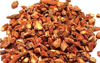 【药材】干燥根茎顶部常有茎基残 余,根茎上生1至多数细长的根。根 略呈长圆柱形,微弯曲,有时分支,其 上生多数细须根,根长约10〜25厘米,直径约0.8〜1.5厘米,支根长约5〜8厘米,直径约2〜5毫米,表面棕红 色至砖红色,粗糙,具不规则的纵皱 或栓皮,多呈?片状剥落。质坚脆,易折断,断面不平坦,带角质或纤维 性,皮部色较深,呈紫黑色或砖红色,木部维管束灰黄色或黄白色,放射状 排列。气弱,味甘微苦。以条粗、内紫黑色,有菊花状白点者为佳。