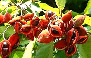 乔木,高达10米。树皮褐色。叶纸质,阔矩圆形至矩圆 状椭圆形,长8〜25厘米,宽5〜15厘米,先端渐尖或钝, 基部钝,?净;叶柄长 2.5〜5厘米。圆锥花 序下垂,长8〜28厘米;花杂性,无花冠;花 萼粉红色,5裂至中部,裂片三角状条形,被短 柔毛;雄蕊柱柔弱,弯 曲;雌花少数,子房有 毛,具柄,5裂,花柱弯 曲。菁荚革质,卵状,长 4〜8厘米,宽2.5〜3.5 厘米,具喙,熟时暗红 色,被短绒毛。种子1〜5颗,椭圆球形,暗栗 色。花期5月。果期6〜7月(贵州)。野生山坡林内或灌丛中,亦有栽培。分布广东、广西、贵州等地。