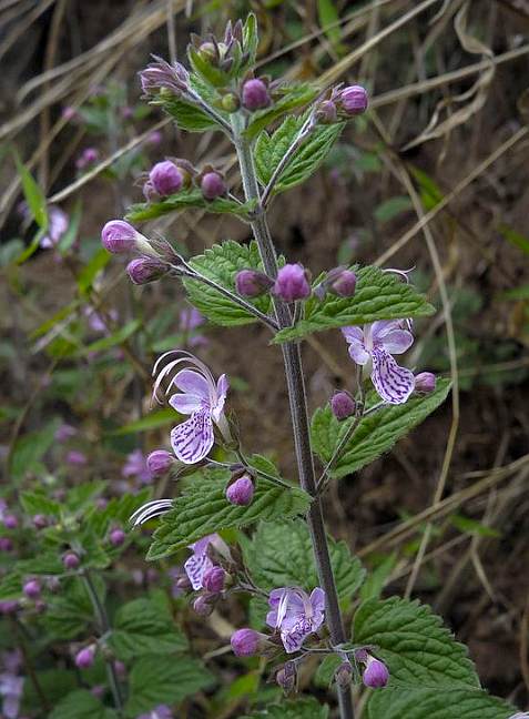 多年生直立草本,高约80〜100厘米。茎被白色柔毛,嫩 枝四棱形。叶对生,宽卵形,长约3厘米,宽约2.5厘米,边 缘有粗锯齿,被白色柔毛;、叶柄长约7毫米。聚伞花序腋 生;萼钟状,4裂,裂片卵形,先端尖,被柔毛;花冠淡紫红 色,5裂,左右对称,上面4裂片根等,最下1片较大,且具 紫红色斑点;雄蕊4, 2强,伸出;子房4室,花柱细长,较雄 蕊为长,先端2歧。蒴果,4裂,为宿萼所包。花期4〜5月。多生于山坡下部灌丛草 地。分布四川、陕西、甘肃等地。