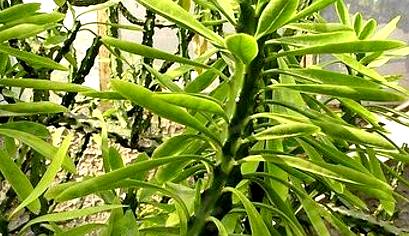 直立、肉质、秃净灌木或乔木,高可达7米,含白色乳汁。树皮灰白色,有浅裂纹;老枝圆柱状,或钝三至六角形;小枝有3~5条厚而作波浪形的翅,翅的凹陷处有一对利刺。单叶耳生;少而小,具短柄,由翅边发出,肉质;倒卵形,先端浑圆,长8~12厘米,宽3~4厘米,全缘,基部楔形,上面深绿色,下面较浅。聚伞花序由3个总苞构成。具短柄,生于翅的凹陷处;总苞半球形,直径约1厘米,黄色;花单性,无花被,雌雄花同生于总苞内;雄花多数,有1具柄的雄蕊,通常有极小的苞片;雌花无柄,生于总苞的中央,仅有1个3室的上位子房,花柱分离,2裂。蒴果球形,径约1厘米。花期3~4月。