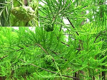 落叶乔木。常由根部产生木质的瘤状体伸出地面。冬季 侧生,小枝与叶一齐雕落。叶异型,营养枝上的叶为扁线形或针形而稍弯,长约1厘米, 排成3列;果枝上的叶为 ?形相叠;叶在春夏均呈 鲜绿色,人秋?变为褐色。 雌雄同株,雌雄球花同生 于一枝上,或生于邻接的 枝上。球果直立,顶生,卵 形或长椭圆形,长1〜2 厘米;鳞片约20枚,木质, 长形,脱落。种子卵形,长 0.5〜1厘米,种皮薄,先 端有斧形的翅。花期夏、生长于河畔及近水处。 分布广东、福建等地。
