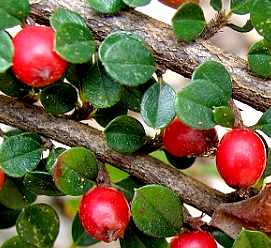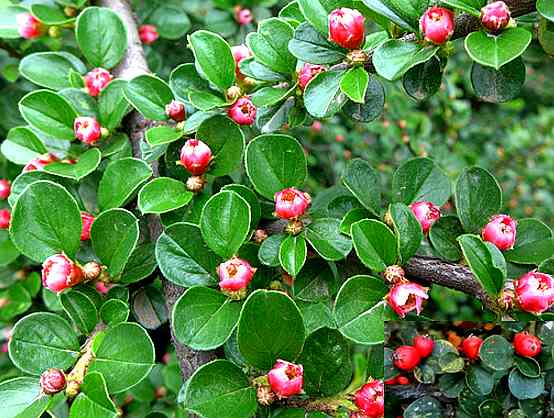 落叶或半常绿低矮灌木,高约50厘米,分枝向两侧水平展开,有短柔毛。叶互生,近圆形至广椭圆形,长10~12毫米,宽4~9毫米,先端具细尖头,基部圆形或尖,上面深绿色,下面脉上及叶柄上有平贴硬毛;叶柄长1~2毫米;晚秋一部分叶变红色或橙红色。花1~2朵,粉红色,生于距状短侧枝的顶端,近于无柄;萼5裂,微有毛;花瓣5片;雄蕊20。果实近球形,长约5毫米,鲜红色,常有3核。花期6月。果期9~10月。