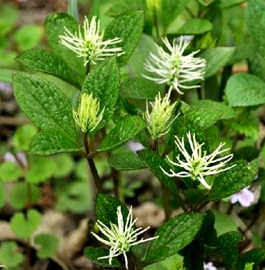 多年生草本,高20〜30厘米。茎节明显,节上生?片状 小叶。叶对生,常两对生于茎端,近纸质;叶片广卵形或椭 圆形,长4〜12厘米,宽2.5〜5.6厘米,先端钝或渐尖,基 部广楔形,边缘具糙锯齿,齿尖有一腺体;叶柄长16厘米。 花序单一,穗状,长4〜6厘米,无花柄及花被,而具苞片;苞 片倒卵形,先端3齿裂;雄蕊3枚,由药隔膨大而相愈合,中间2室,两侧1室,全发育,先端3裂,伸长成线形,长可达2〜3厘米,乳白色;子房卵形。果倒卵形。花期4〜5月。果期 6〜7月。
