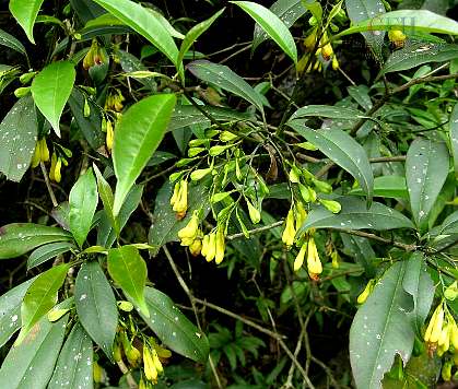 灌木,高约1米。叶互生,有短柄;叶片椭圆状披针形,长 5〜9.5厘米,宽1.5〜3厘米,先端尾状长尖,基部楔形,全 缘,下面黄绿色。总状 花序常数枚呈束状;萼 片5,外轮3枚卵圆形,边缘带紫红色,内轮2 枚较大,花瓣状,黄色;花瓣3,中间1枚龙骨 状,顶端有缨;雄蕊8,花丝下部合生;子房2 室。蒴果;种子2颗。