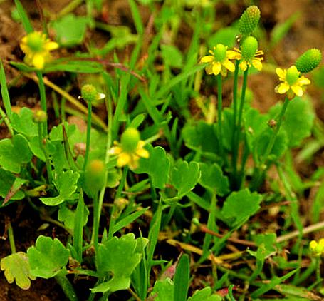 多年生草本,具匍匐茎。叶均基生,叶片近圆形、肾形或 宽卵形,长0.4〜2.5 厘米,宽0.4〜2.8厘米,3或5浅裂,有时3裂 近中部,基部宽楔形、截 形或心形,基出脉3条;叶柄长3〜13厘米。花 茎高4.5〜16厘米,苞 片条形;花径约7毫米;萼片5,淡绿色,宽椭圆 形,无毛;花瓣5,黄色,狭椭圆形,基部具蜜槽;雄蕊和心皮均多数。聚 合果卵球形,长达6 毫米;瘦果紧密排列,扁,具纵肋。